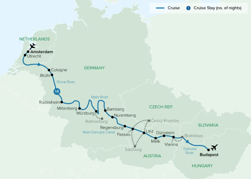 Explore Nuremberg, the site of Hitler’s infamous rallies. Wander the cobblestone streets, discovering hidden boutiques and artisan stores. Finish your day cruising through the Main-Danube Canal, crossing Europe’s Continental Divide thanks to the canal’s 16 stair-step locks. Daily: Breakfast, Lunch, Dinner
