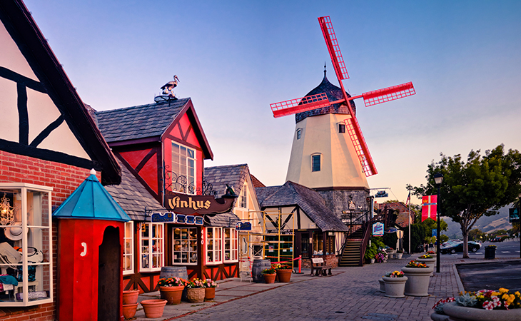 Old World Charm, Modern American Comforts. In the breathtaking Santa Ynez Valley of California lies the Danish-inspired village of Solvang, also known as Little Denmark. Here you’ll find cobblestone streets featuring Old World architecture highlighted by gingerbread trimming and thatched roofs, and a wonderland of windmills, flower baskets and flying pennants. Just outside your door you’ll discover the bustling downtown shopping district filled with European wares, antiques and aromatic bakeries. There are also several wine-tasting rooms in town, and more to explore in scenic Santa Barbara County wine country.