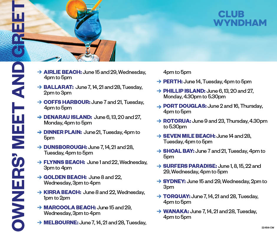 We have finalised the June schedule for Owners’ Meet and Greets (informally called Owners’ Drinks), where you can meet the onsite resort team and your fellow club owners.