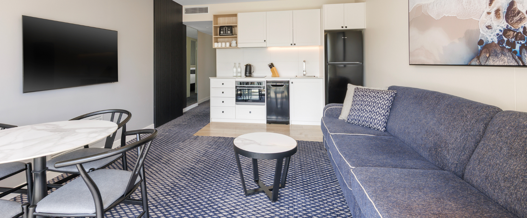 In line with the new design vision, all apartments now feature brand-new carpets, stylish furniture, updated bedding and bedheads, modern TVs, and soft furnishings. Window treatments and lighting have been refreshed throughout, along with some minor bathroom upgrades to elevate your stay experience.