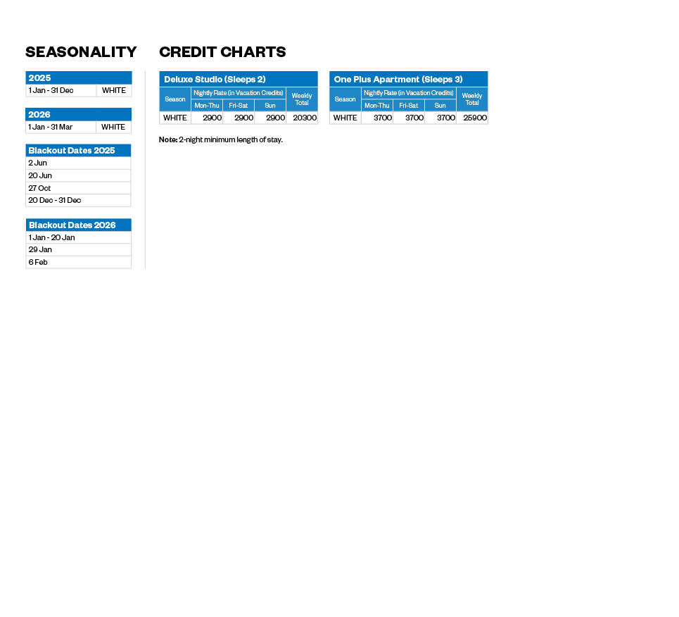 This is an Associate Resort. Associate Resorts is a Developer benefit and at its sole discretion, has, from time to time, made available various Associate Resorts to Premier owners who are in good standing. Access is for a limited duration, subject to additional restrictions and may be added, removed or modified by the Developer without notice. Credits used towards this benefit must have a minimum of six months (180 days) validity to be accepted. Housekeeping token/s or a fee must be tendered when utilising this benefit. Complimentary housekeeping cannot be used in conjunction with this benefit. The booking window to make a reservation at an Associate Resort may vary by location or Lifestyle tier.
