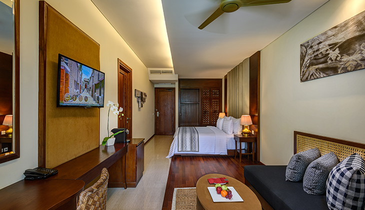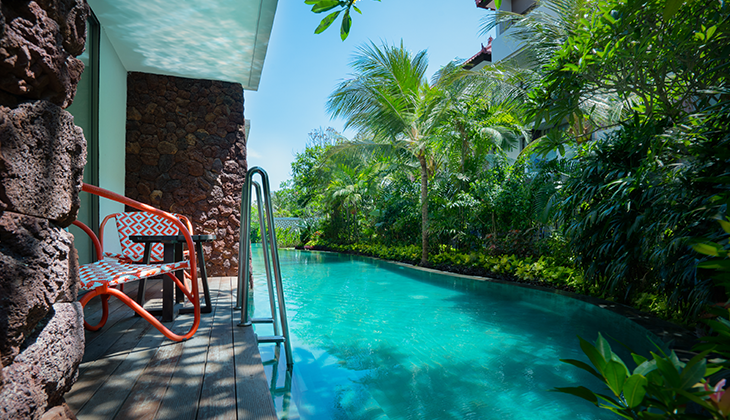 In this world of bright sun, white sand and blue water, Merusaka Nusa Dua sits right on the renowned Nusa Dua Beach – also known as Pantai Mengiat Beach – a calm, usually uncrowned strip with a 500-metre-long reef barrier offering protection. Pockets of coastline are even suitable for snorkeling, while local operators offer fishing trips and sightseeing in glass-bottomed boats.