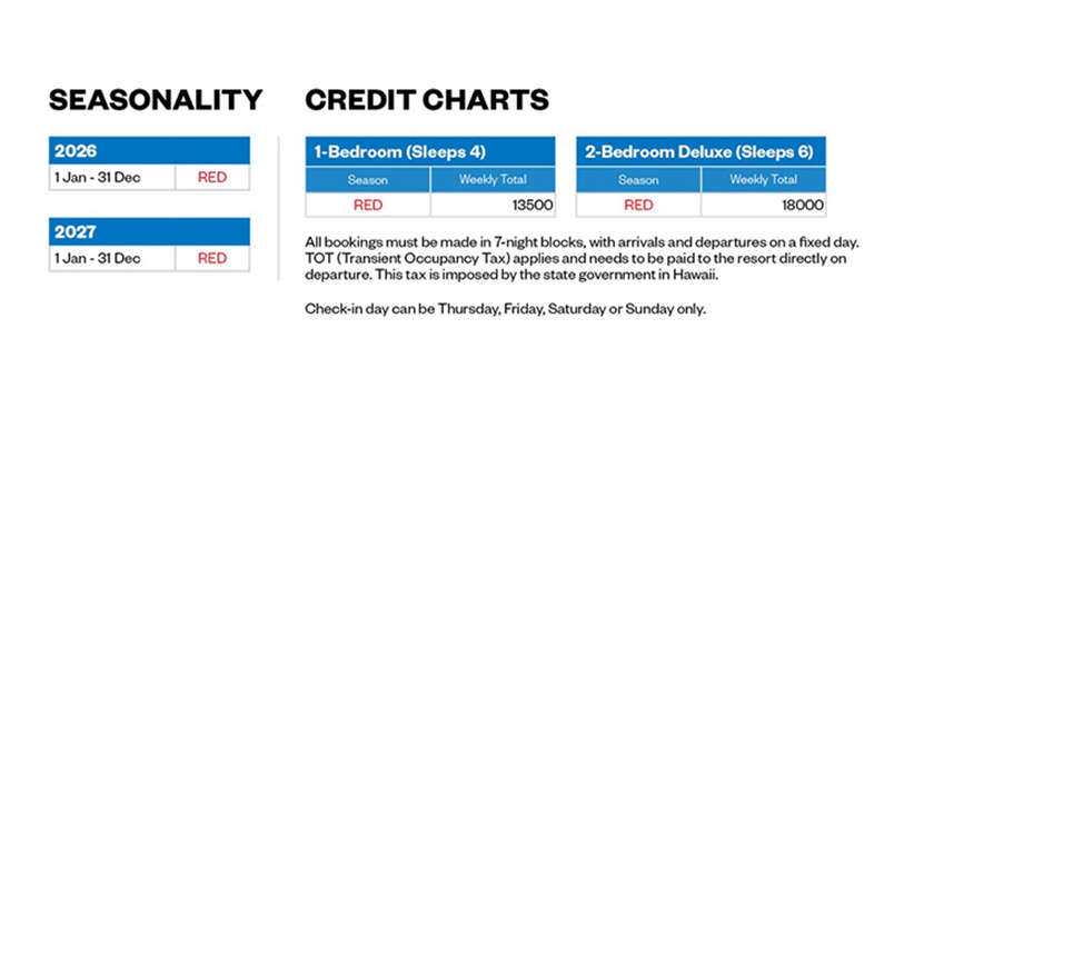- Multiple reservations can be made by each Owner to build a stay of multiples of 7 nights, however a housekeeping fee applies to each 7-night booking and a room move may be required.