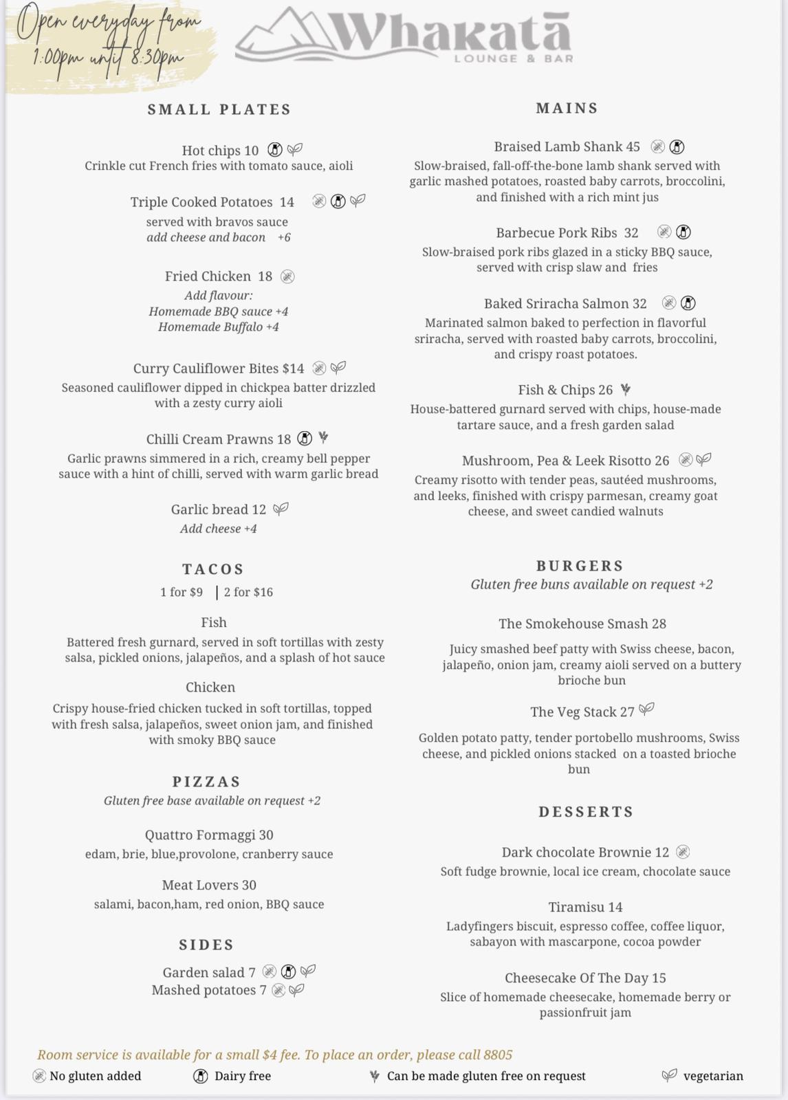 Craving something later? Our all-day menu is available from 1 pm to 8:30 pm, offering a delicious selection of snacks, mains, and desserts to satisfy every craving.